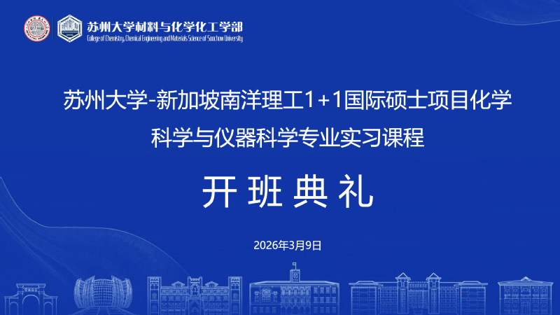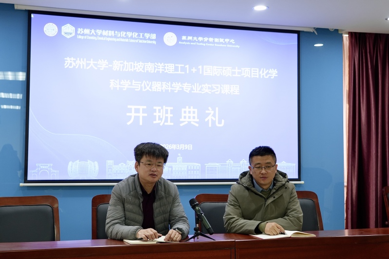 2026年3月9日上午9点,苏州大学-南洋理工大学1+1国际硕士化学科学与仪器科学专业实习课程开班典礼在苏州大学独墅湖校区北区704号楼五楼会议室举行。苏州大学材料与化学化工学部副主任杨炯,苏州大学分析测试中心主任朱健、副主任俞仁琰、课程负责人舒婕、各实验室室主任,以及该专业2025级全体学生参加了此次典礼。会议由杨炯副主任主持。